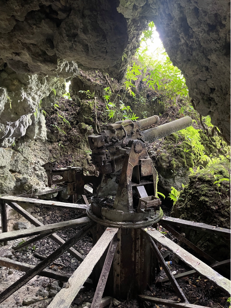 Directly over the bridge, we stopped at another WWII ruin, Kaigun Sho, the ruins of a Japanese Communications Centre. It was built in the shape of a cross and disguised as a field hospital to avoid being attacked, although eventually the allies discovered their trick and bombed it. We could see various remnants from the war, including tanks and guns. A sign indicated that you needed to buy a ticket from the Airai State Office or risk getting fined 500 USD but there was no one around to collect a ticket so we visited gratis.