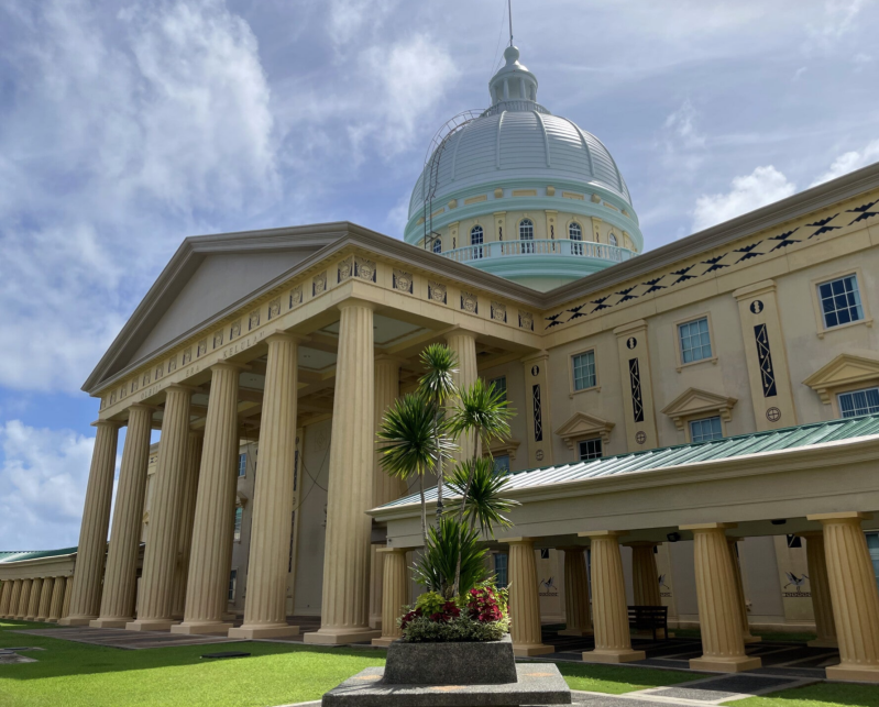 The centrepiece of Ngerulmud is its grand capitol complex, which began planning in 1986 and was officially opened in October 2006. The complex cost over US$45 million to construct (partly through a loan from Taiwan) and includes buildings for the legislative, executive, and judicial branches of government. A central open plaza connects these structures, creating an architectural focal point for the small city. The design of the complex reflects both modern and traditional Palauan elements, making it a symbol of the nation's identity. As we wandered around the complex we fully expected armed guards to emerge and tell us to leave but we barely saw any people except for maintenance workers and gardeners, probably because, as we learnt later, the capital was previously in the island of Koror and staff did not want to relocate. Palau had only gained independence from USA in 1994, hence the idea of creating this new capital, but the complex has been seen as a failure due to its isolation with staff only commuting for work or even staying in Koror.