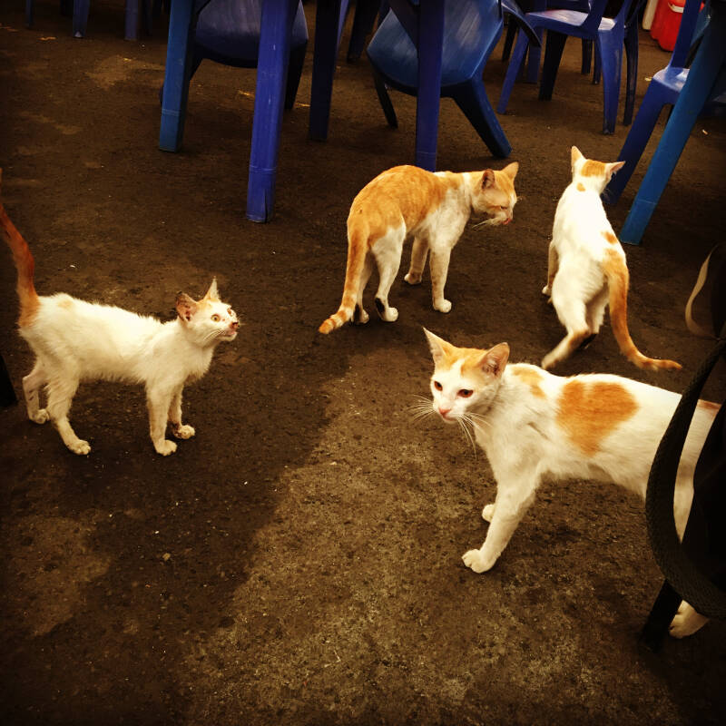 After enjoying appetiser, main course (fusion enchilada for me and spiced corn for Andy) and dessert of a home-made banana icy pole we ventured over to the hip and grungy suburb of Plobacian to check out the location of Agimat, a restaurant we were told offered fire and drumming alongside cocktails and intended to return when it opened at 6pm, which is twilight in the Philippines. Plobacian, previously notoriously renowned as a red-light district and for the somewhat unPC theatre of ‘dwarf’ boxing has undergone a renaissance and is now quite a hipster suburb replete with street art and artisan bars. Heading back towards Mandalulong, I was thirsty and Andy was hungry so we gravitated towards yet another market which offered home-made lemonade, juices, plenty of seafood and traditional stir fries, which Andy partook of. Like most parts of the Philippines, the market was also the home to a number of underfed, probably stray cats. I noticed that most cats in Manila were ginger, and across town there was little deviation from this prompting me to consider that they may all be related.