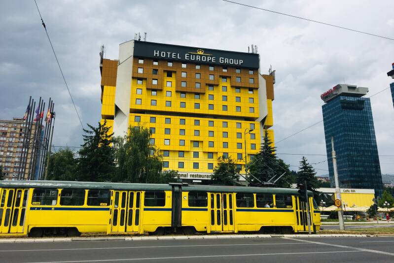 Yellow tram in front of a rebuilt hotel, the original was razed during the siege.