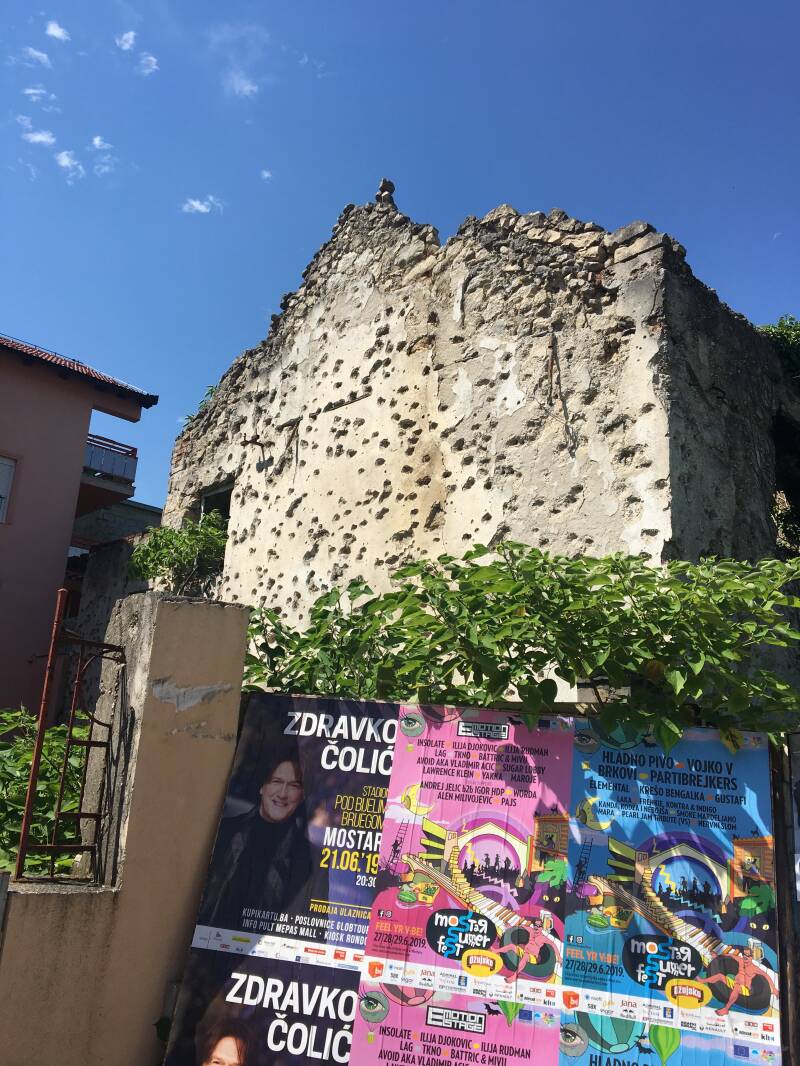 Mortar damaged wall from the Bosnian war and an enticing music festival poster.