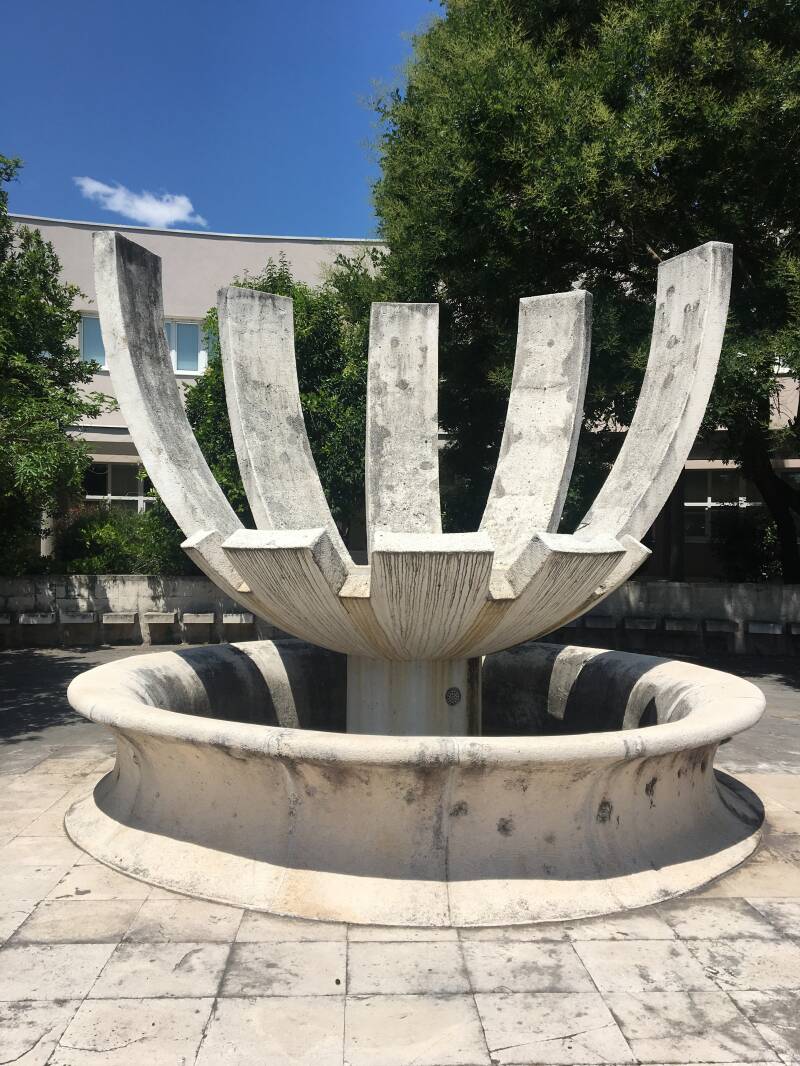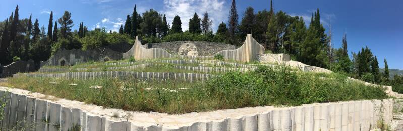 A serpentine pathway and two stairways lead to a big lower platform from where the view stretches over Mostar. From a lower platform, a stairway behind the wall leads to a smaller upper platform with a fountain and the central architectonic feature – a ‘cosmological sundial’.