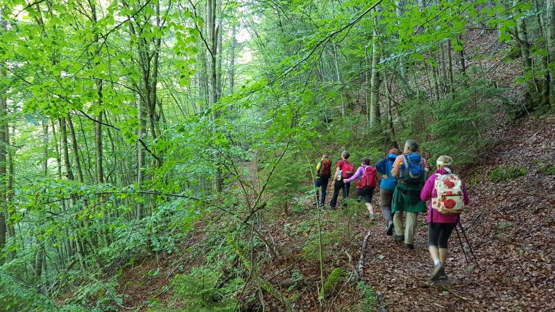 Emerging back into sunlight, we passed through Yagodina village, a charming cluster of homes surrounded by smallholdings. After lunch, in which we nearly had to fight off a group of friendly cows, our Bulgarian guide, Nadya, offered us a choice: ‘Do you want to go up up or only slightly up?’ she gestured, with vertical and horizontal hand motions. We looked up at the ‘up up’ mountain and most of us decided to give it a go. ‘Slightly up’ meant a more economical walk around the corner, but no experience of the mountain. But from Day 5 onward there was no choice; it was ‘up up’ all the way.