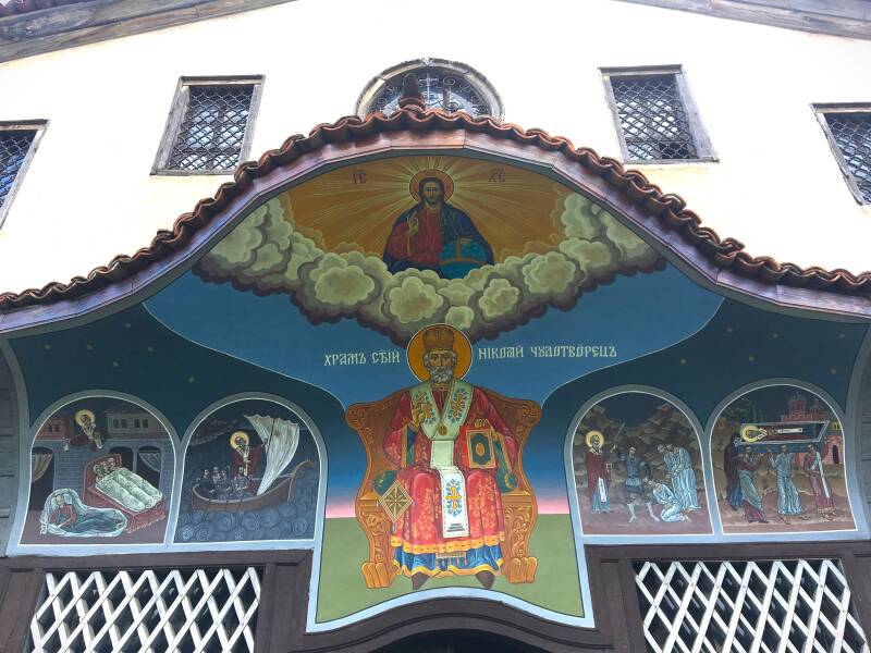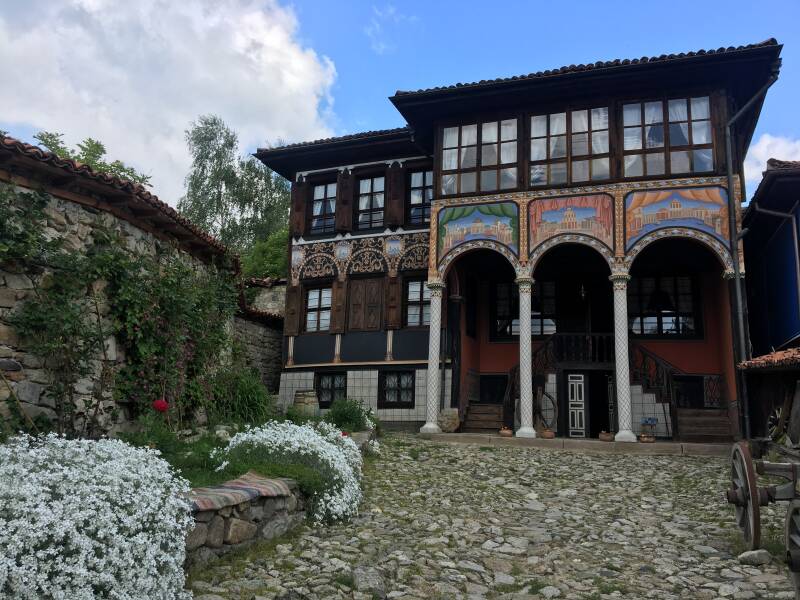 One of the delightfully painted buildings we visited was the Oslekov House. Built between 1853 and 1856 for the well-heeled trader Nencho Oslekov, the house still holds its breath under three columns of Lebanese cedar that lift the ceiling of a grand upstairs salon. The walls bloom with scenes of distant cities and curious landscapes, like postcards from places he never quite reached. Every corner is dressed in carved wood and rich colour, quiet proof of how the wealthy lived in Bulgaria’s revival era. Oslekov himself wasn’t just a man of taste but a man of courage. He backed the April Uprising, outfitting rebels from his own fabric workshop. The revolt failed, and he paid with his life, executed in Plovdiv. The house stands as a stubborn reminder of both his comfort and his courage.