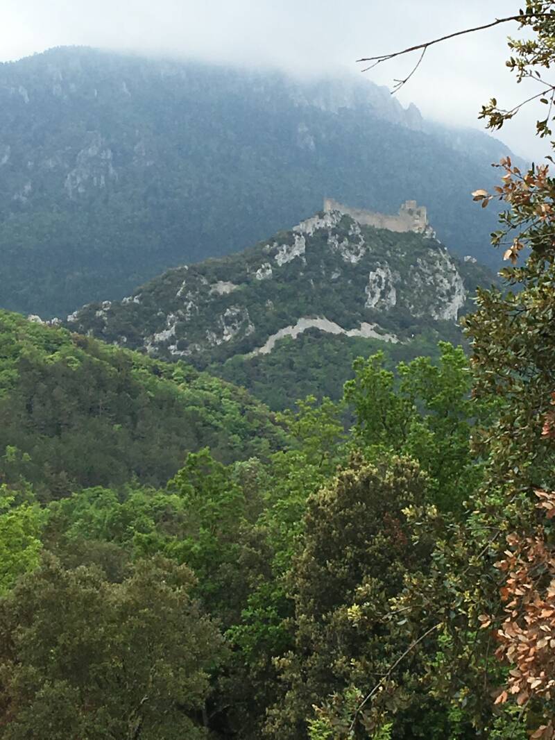 The Château de Puilaurens (Occitan: lo Castèl de Puèg Laurènç) in the distance, with the street of our cottage below.